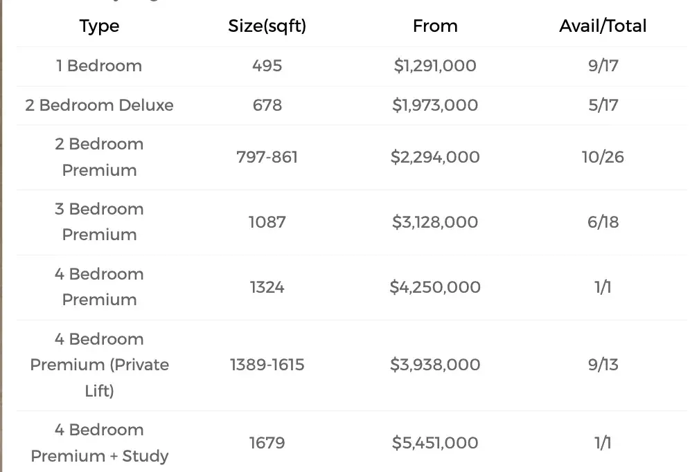 At the higher tier, 4-bedroom premium units (1,324 sqft) are available from approximately $4.25M, while larger configurations such as 4-bedroom premium (private lift) units (1,389–1,615 sqft) start from $3.93M, and 4-bedroom + study units (1,679 sqft) reach up to $5.45M, catering to buyers seeking luxury living and exclusivity.